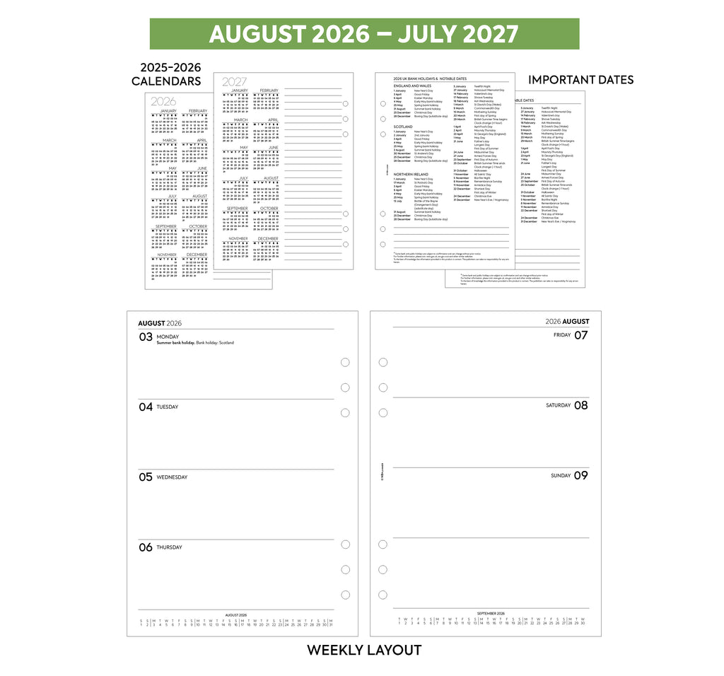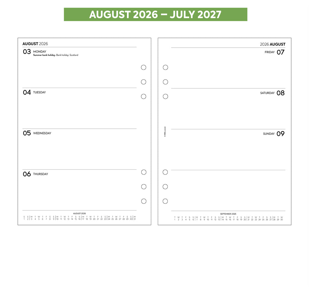 • Week on two pages diary (UK bank holidays): August 2026 – July 2027