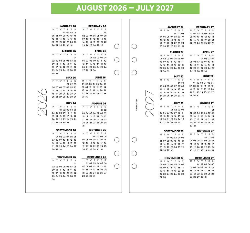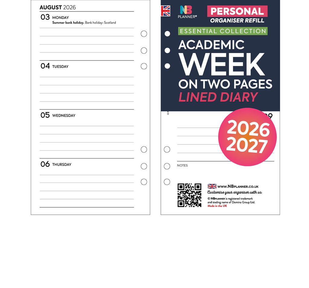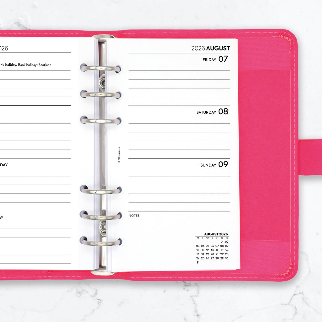 Academic 2026-2027 Week on two pages lined diary organiser refill to fit in Personal size 6-ring organisers