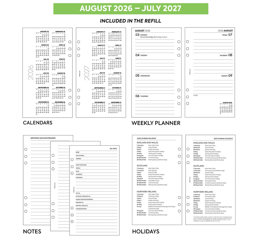 • The refill is compatible with Filofax personal size organisers, WHSmith small organisers, Wilko A5 organisers, Kikki K medium organisers, Poundland organisers and other 6-ring binders. Please see the size guide..