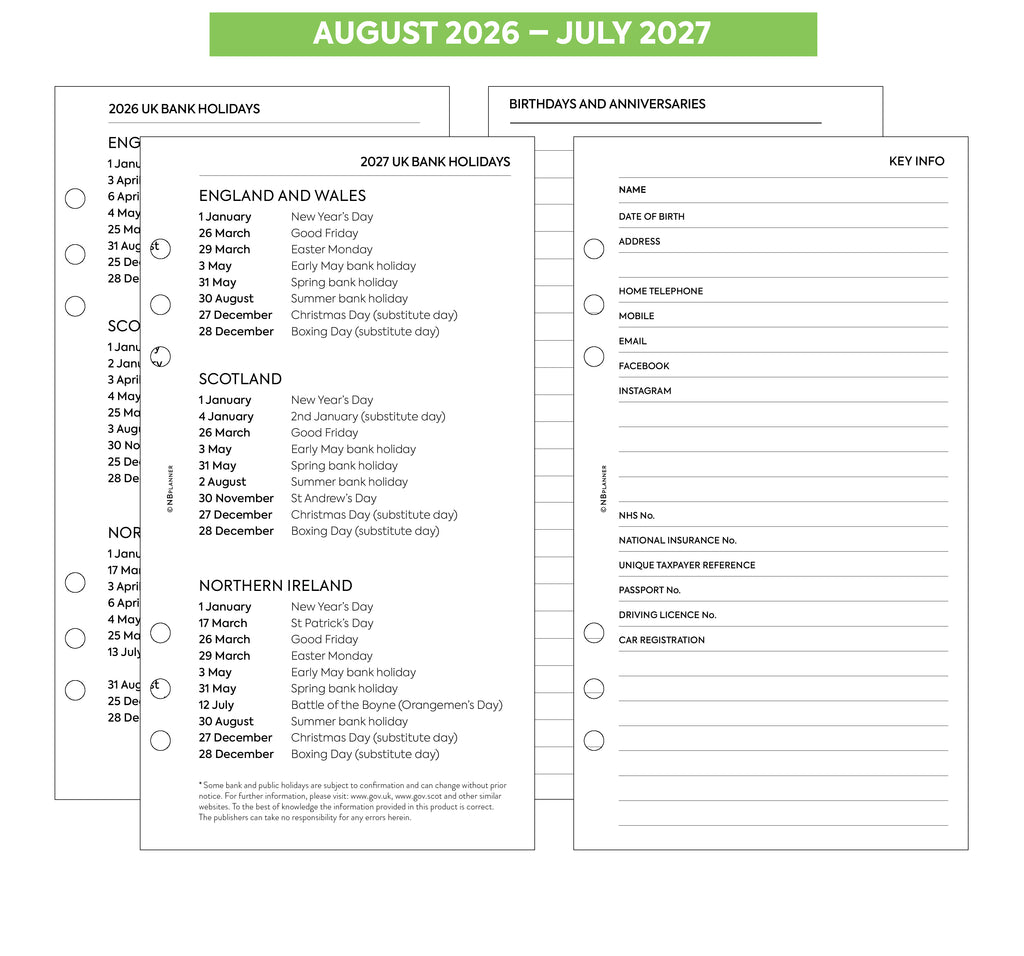 • Week on two pages lined diary (UK bank holidays) August 2026 – July 2027